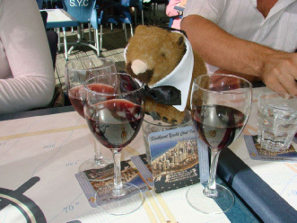 It was during this trip that Wallys true appreciation of booze came to light ... while he had enjoyed a quiet afternoon ale with Nick and Tony from time to time onboard Ootnic back in Gibraltar, dressed up in his glad rags it all went to his head and it became clear that he shared Nicks taste for Boags and certainly wasnt shy when it came to a glass of fine wine - it was at this point we realised we were going to have to keep a bit of an eye on this naughty wombat!